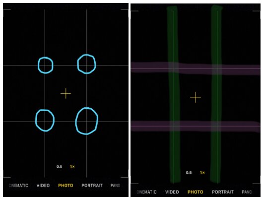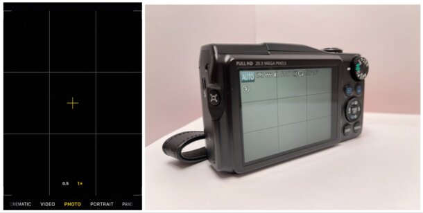 Left: Grid lines on a smartphone camera; Right: Digital camera with grid lines turned on