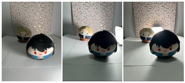Lighting plushies from the front (left), side (middle), and back (right)