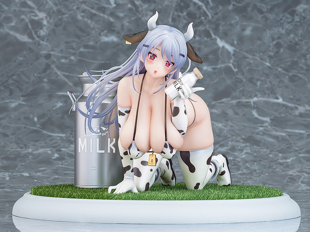 From illustrator Nadare Takamine’s original work "BUNNY SUIT PLANNING" comes a 1/6 scale figure of Shion Blankness! As with the previously released Sophia F. Shirring: Cow Bikini Ver., the bold cow-print bikini compliments her stunning physique. Her pose, kneeling on the grass-like base with her upper body leaning forward, takes advantage of her curves; her arched silhouette pulls you in like gravity. Her calm demeanor hides hints of seduction you can't escape. Her cow-print bikini was designed with as little fabric as possible, and her gloves, knee high socks, bikini straps and other details were faithfully reproduced to emphasize differences in texture.
